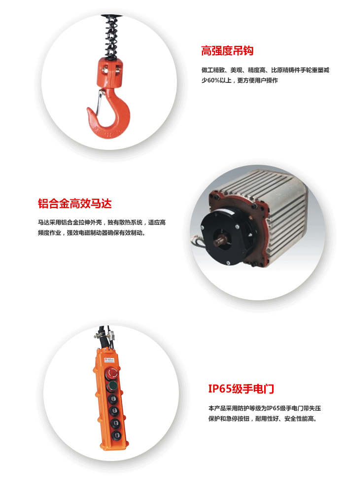本機設有限載保護裝置,可避免超載時引發的不良后果;起重吊鉤設有閉鎖裝置,可防止鎖具意外滑脫;電機設有熱保護裝置,當電機因頻繁使用引起溫升過高時,該裝置會自動切斷電機以保護電機不至于被燒壞;本機設有上、下限位裝置,當吊鉤上升或下降至極限位時,本機會自動切斷電源,吊鉤隨即停止動作;本機設有緊急停止按鈕,使操作者于危急狀況是,能立即關閉電源。