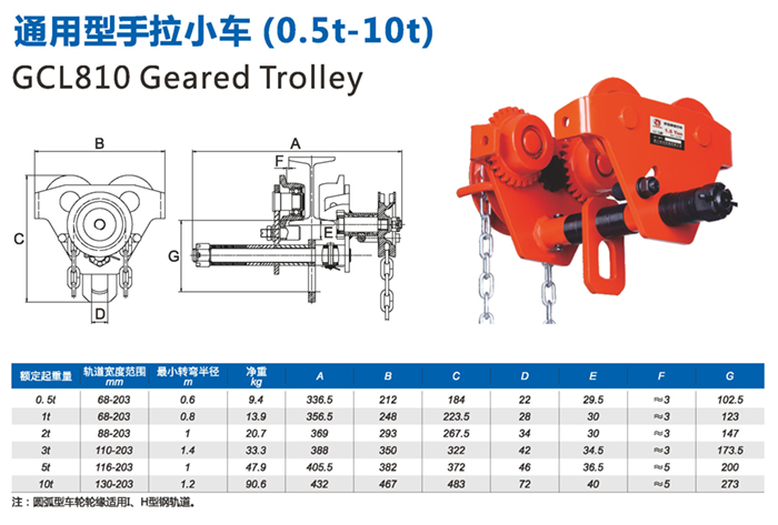 常規(guī)型手拉小車(chē) GCL/GCT810系列小車(chē)選用了全新的高強(qiáng)度低合金結(jié)構(gòu)鋼,確保4倍安全載荷,輕巧、安全、安裝方便、是目前最為輕巧小車(chē)之一。 1.采用優(yōu)質(zhì)鋼材,結(jié)構(gòu)緊湊,外型美觀。 2.國(guó)際標(biāo)準(zhǔn)生產(chǎn),安全性能可靠。 3.可多種選擇,“H”型鋼、“I”型鋼均可適用。